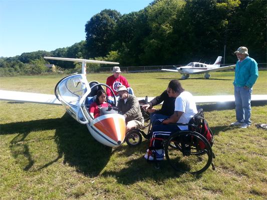 Sailplane flying doesn’t require any adaptation and is accessible for wheelchair users. For added comfort you may want to bring along a comfortable cushion for the seat. Sailplaning involves being towed by a power plane to take flight. Once altitude is reached the pilot releases the towrope. You use a joystick that is mounted on the left side to control the rudder and another joystick that is located in between the legs, which controls roll and pitch. Depending on the weather, you can have a relaxing smooth flight or for the more adventurous, you can have an aerobatic ride, which includes doing spins, rolls and loops.