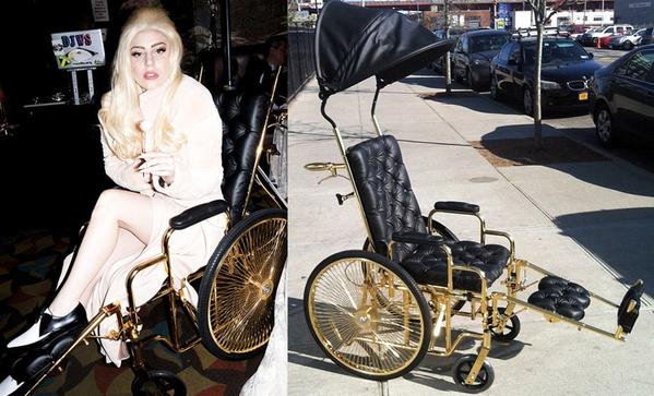 Lady Gaga does everything with style, including using a wheelchair. While she may have only needed it temporarily, she managed to pimp out this wheelchair with 24 karat gold accents, black padded seating and leg rest, plus a canopy to protect her from the outside elements.