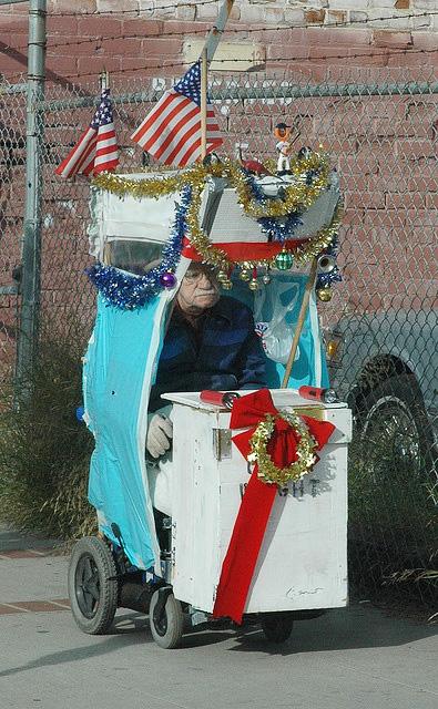 This patriotic powered wheelchair is pimped out with the American flags, figurines, protection from the elements and a convienint box for storage. If you look closely, you will see red flashlights as headlights for night time excursions. It is also decorated for the holidays.