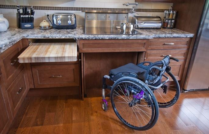The kitchen is often the most frequently used room in the house. There are a variety of things to change including appliances such as lowered stoves and ovens as well as accessible refrigerators. The cabinets and countertops all need to be lowered so it is easy for you to reach. Roll-out storage units are helpful as well. The height and positioning of the sink need to be at a height where you can comfortably roll your wheelchair underneath it. The kitchen table or dining table should measure 27” floor-to-table height and 30” x 48” seat spacing.